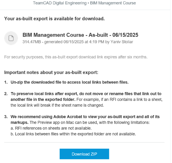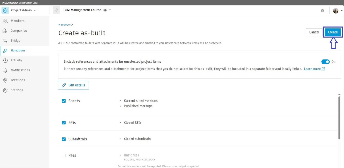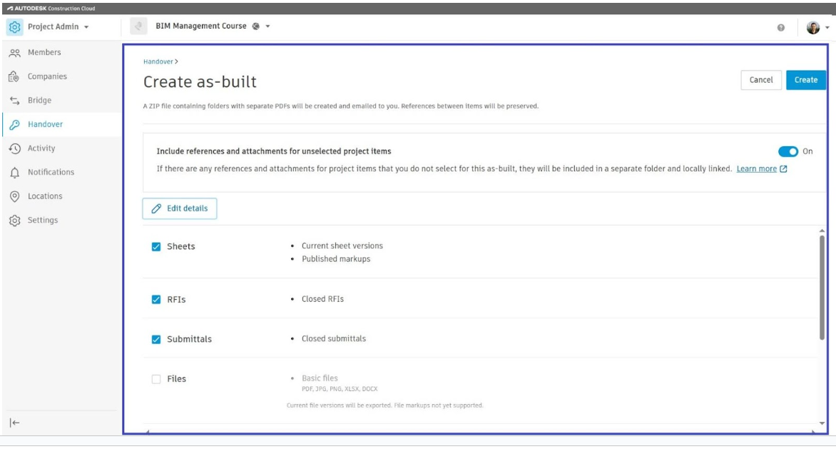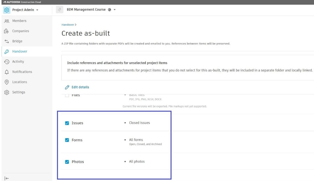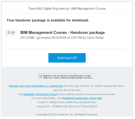 כפי שראינו בטיפים הקודמים ענן Autodesk Construction Cloud מאחסן ומקשר את כל המידע על הפרויקט במקום אחד, משלב התכנון עד הביצוע והמסירה. לקוחות רבים שואלים כיצד ניתן להוציא את כל המידע בסוף הפרויקט ולמסור למזמין. בדיוק בשביל זה קיימת האפשרות Handover or As-built Export. כלי זה מאפשר לנו לייצא לקובץ ZIP את כל המידע שנבחר ולשלוח אותו למזמין או לתייק אותו בארכיון הארגוני.