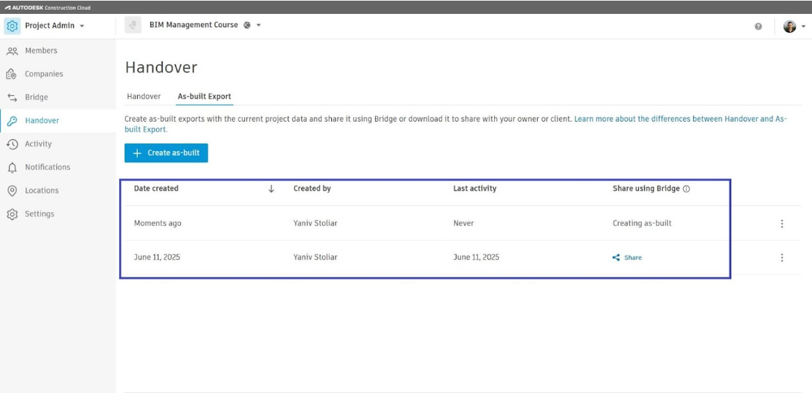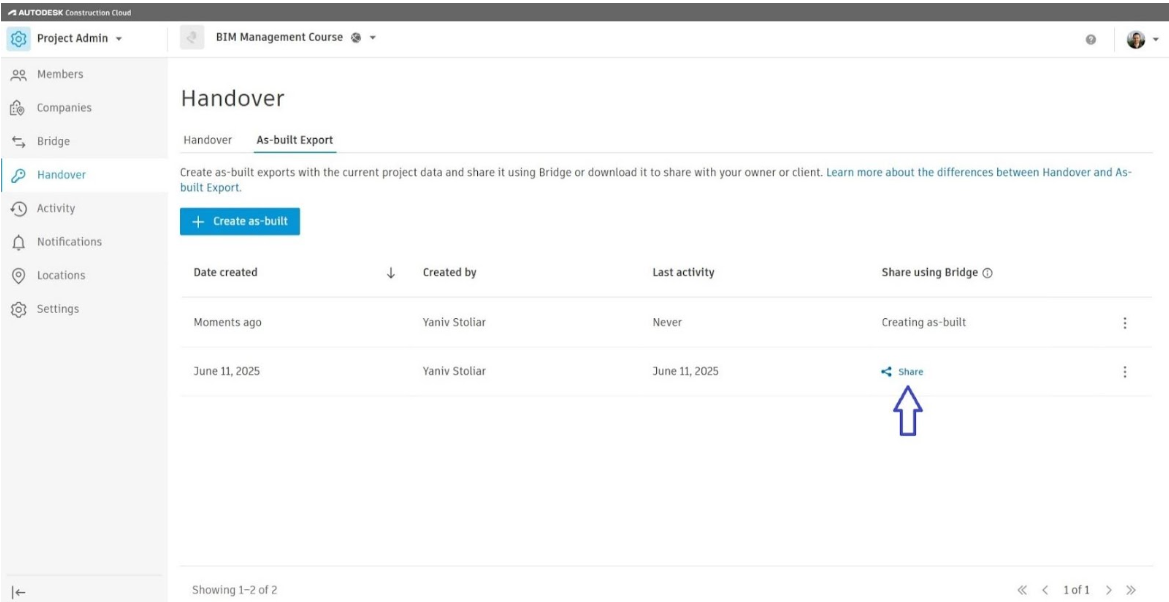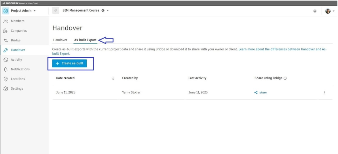 קיימות שתי אפשרויות Handover ו As Built Export