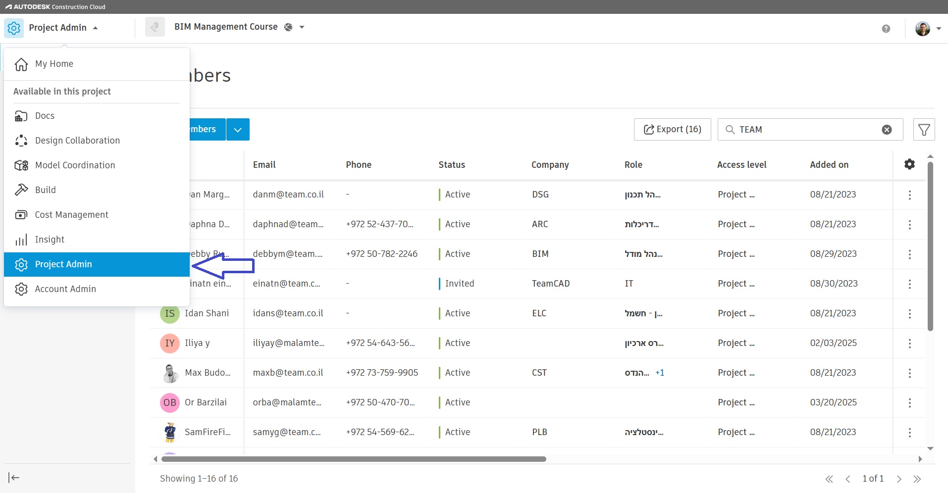 על מנת לייצא את הנתונים בענן יש להיות בעל הרשאות Project Admin ולבחור ב Project Admin בתפריט