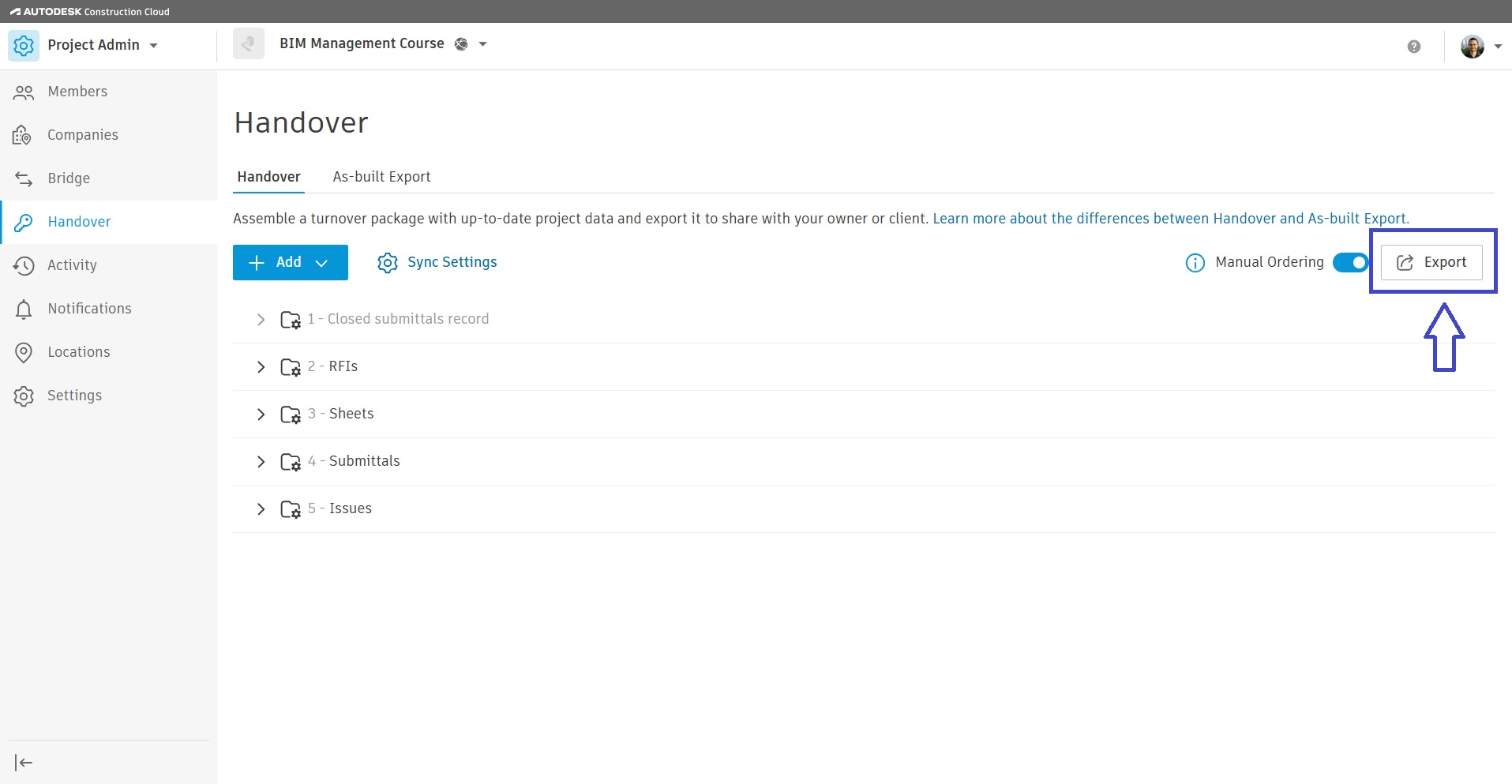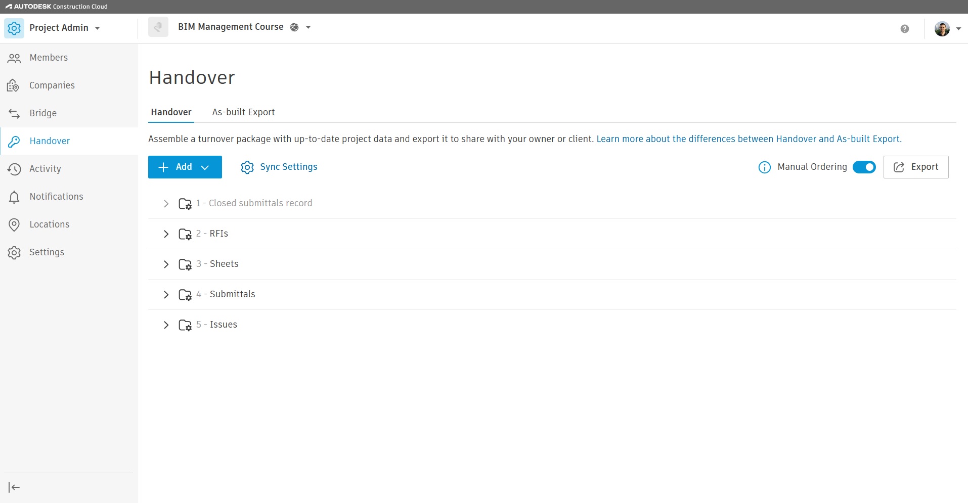 לסיכום, תהליך סיום הפרויקט לא מסתיים רק בביצוע עבודות הבנייה, הוא כולל גם מסירה מסודרת, נגישה ואיכותית של המידע שנצבר לאורך הדרך. מומלץ שיזמים ומזמיני עבודה ינהלו את כל המידע לגבי הפרויקט בענן Autodesk Construction Cloud שלהם, בכך ישלטו ויהיו בעלי המידע בפרויקט ולא יהיה צורך בייצוא הנתונים מכיוון שהם כבר נמצאים ברשות המזמין. עם זאת כאשר אין למזמין ענן משלו וצוות הפרויקט (מתכננים ו/או קבלנים) מעוניינים להנות מיתרונות Autodesk Construction Cloud שימוש ב Handover מאפשר מסירת הפרויקט באופן פשוט ויעיל.